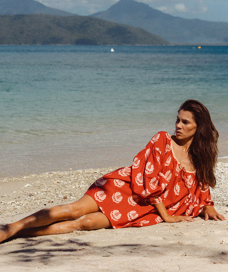 Daughters of India Kyra Midi Dress in Sumac — leaning on rock by ocean, hand screen print cotton Daughters of India Kyra Midi Dress in Sumac — walking on wet sand at beach, screen print cotton
