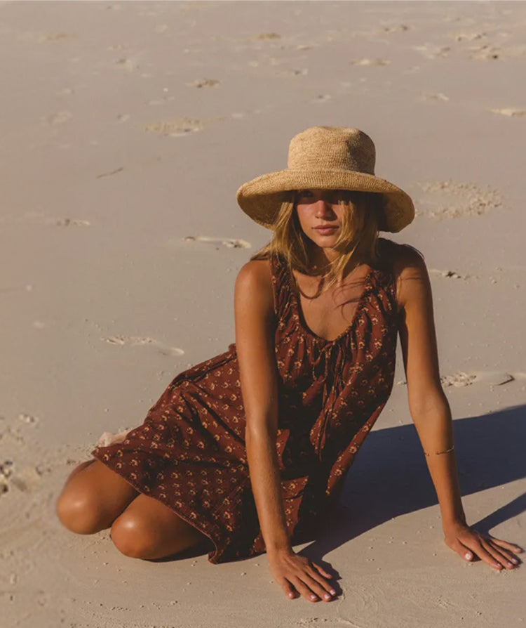 Daughters of India Kyra Midi Dress in Caramel — seated on coastal veranda with ocean view, hand screen print cotton Daughters of India Kyra Midi Dress in Caramel — upper body leaning on veranda wall, V-neckline, billowed sleeves